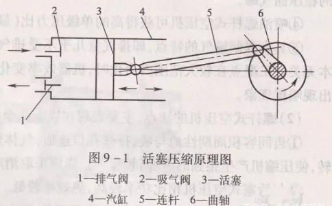 而当活塞行至气缸4左端时,整个排气的过程算是循环了一圈。而此时,曲轴6也恰好转了一圈。这样,在吸气阀和排气阀的控制下,周而复始地重复进行着吸气和排气过程,这就是活塞式空压机的工作原理。